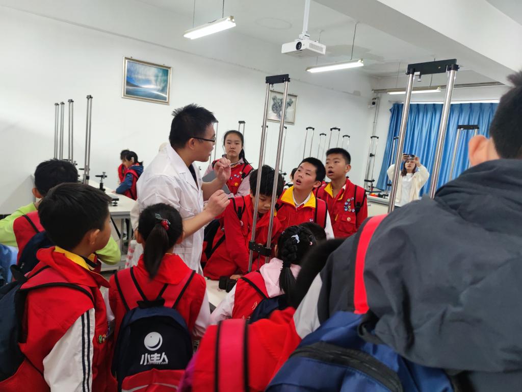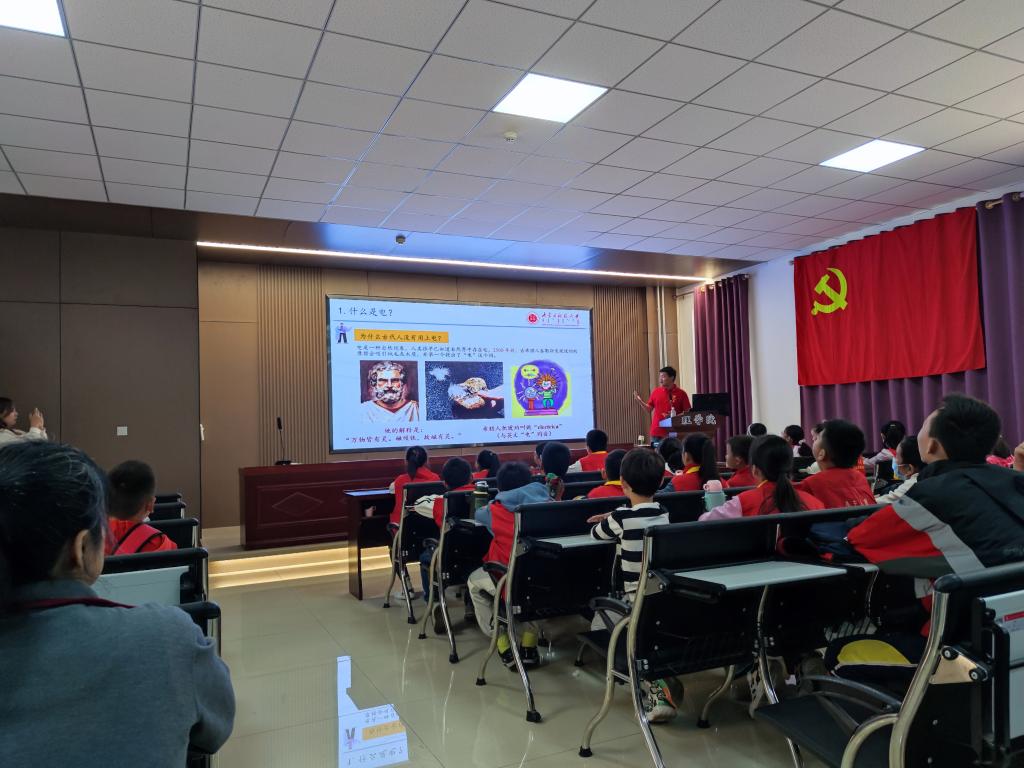 在秋实楼理学院物理实验中心,来自理学院的潮洛蒙、李川飞二位老师为小学生进行了专业的实验讲解和演示,展示了包括静电感应、蛇形摆、无弦琴、无皮鼓等二十余个有趣的实验,通过这些实验的讲解与演示,激发了孩子们对科学的探索欲和求知欲。在明德楼E205报告厅,科普党员志愿者们带来了科普小讲座,并为小学生们送上电学动手趣味实验包。小学生们在志愿者的指导下,动手安装电池、导线、开关,成功使小台灯发光;左珊珊老师为小学生们讲授了“认识党旗”的微党课,使红色教育融入科普实践中,使思政教育有形有感。