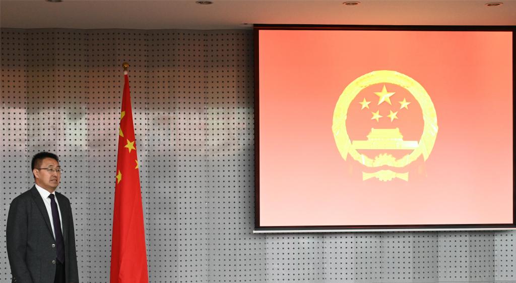 宣誓仪式上,奏唱中华人民共和国国歌,领誓人韩永全面向国旗和国徽,手抚宪法、领诵誓词,宣誓人跟诵誓词。