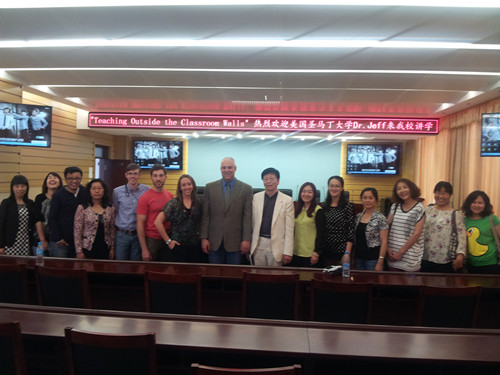 5月21日下午,在我校重点实验室405会议厅,杰夫教授为我校师生带来了一场精彩纷呈的讲座,讲座的题目是“Teaching outside the walls”----“教育不仅仅局限于课堂”。杰夫教授以其生动的语言和独特的视角为我校教师介绍了新的教学理念和角度,他认为所有的教师都不应该把教学局限到课堂内,教师应该是生活的很好的观察者,并培养学生以独特的视角观察身边事物,从而获得知识和启迪。