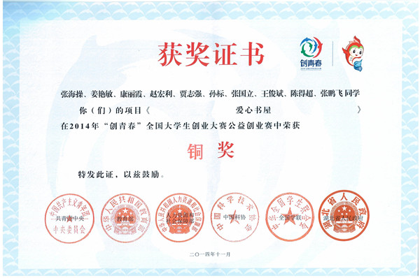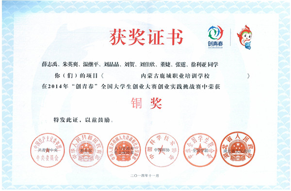 我校在本次比赛中共获得五项铜奖,其中机械学院项目《包头绿鹿科技有限公司》荣获创业计划竞赛铜奖;创业孵化园项目《内蒙古鹿城职业培训学校》、艺术与设计学院项目《包头市迪克创意设计有限公司》均荣获创业实践挑战赛铜奖;能环学院项目《爱心书屋》荣获公益创业赛铜奖;材冶学院项目《悬赏谷有限责任公司》荣获移动互联网创业专项赛铜奖。
