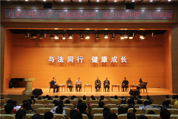 12月4日,由校团委、党委宣传部、文法学院、我校法律硕士教育中心主办的“与法同行,健康成长”法制论坛在校音乐厅举办。此次论坛邀请包头市人大常委会委员、法制委员会委员、内蒙古天祺律师事务所孟凡东、包头市昆区人民法院副院长王丽荣、包头市人民政府检察委员会专职委员张志杰、包头市人民政府立科科长左纯彬、我校文法学院学术院长朱海坤、文法学院副院长李永林以及我校文法学院法学专业2013级学生呼燕霄作为论坛嘉宾。校团委相关负责人,青马班学员与各院学生代表参加此次论坛。
