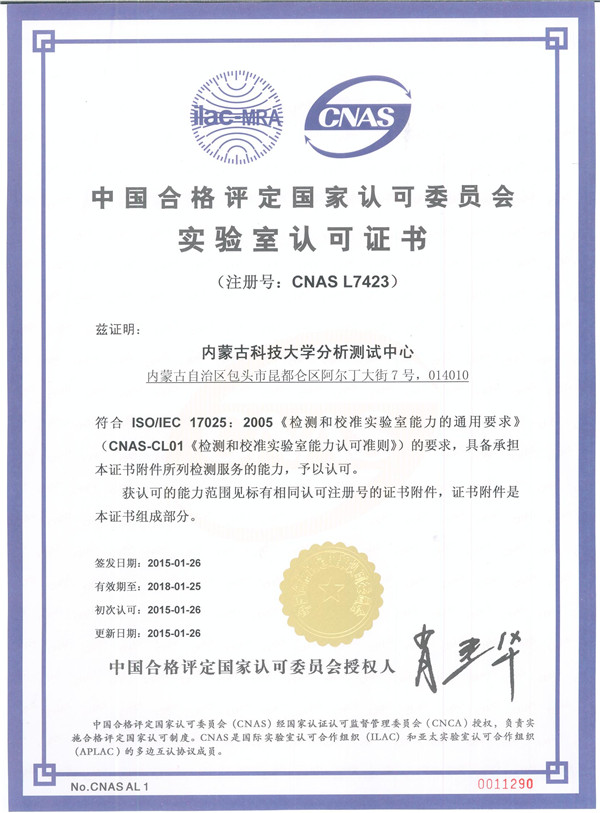 1月26日,中国合格评定国家认可委员会(简称CNAS)正式向我校分析测试中心颁发实验室认可证书。