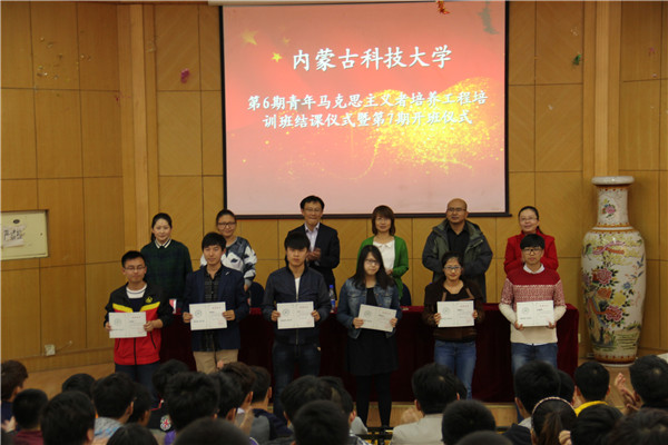 会上,青马班负责老师向全体参会人员简要介绍了我校“青年马克思主义者培养工程”实施方案;校团委相关负责人宣读了第6期青马班优秀学员表彰决定,并为第6期青马班优秀学员颁发了荣誉证书。艺术与设计学院12级广告设计专业的田静怡同学、文法学院13级汉语言文学马云静同学分别代表第6期青马班优秀学员和第7期青马班学员发言。最后,校团委相关负责人为大会致辞,并对青马班新老学员提出四点要求和希望:第一、学生干部必须要不断提高自身的思想政治素质,树立正确的世界观、人生观、价值观。第二,学生干部要加强学生科学文化知识,妥善处理学习与工作的关系。第三、学生干部应不断提升自己的工作能力和服务水平。第四、学生干部要不断增强团结意识与团队合作能力。统一思想,明确任务,充分认识实施青年马克思主义者培养工程的重大意义,通过在青马工程培训班的理论学习和实践锻炼,不断提高理论水平和工作能力,勤于思考,勇于实践,乐于奉献,身体力行,率先垂范,争做坚定的青年马克思主义者。