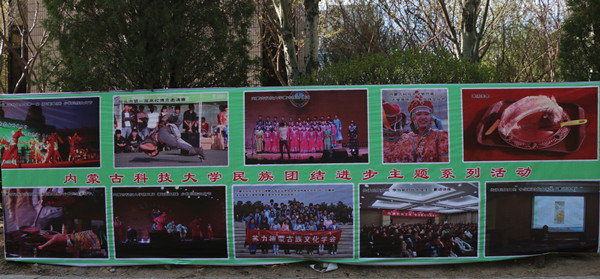 我校这次的宣传活动紧紧围绕包头市提出的“守望相助适应新常态,团结奋斗谋求新发展”的主题,重点开展了党和国家的民族政策、法律法规,中央和自治区有关民族工作会议的精神,民族理论和民族基本知识,民族工作的相关规章制度等的宣传。