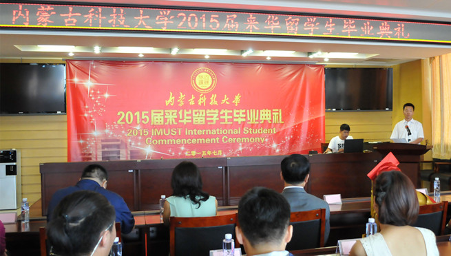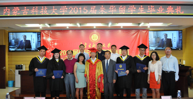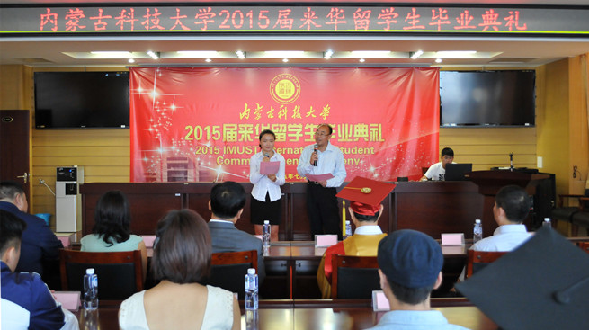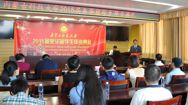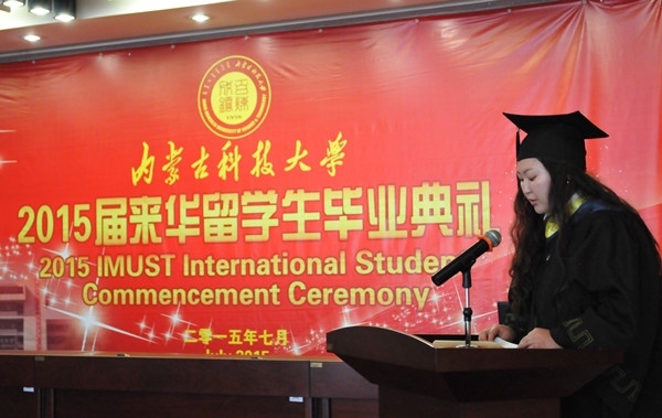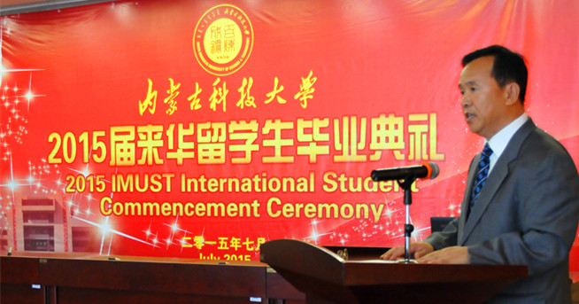 李国雄代表学校致辞。他首先向圆满完成学业的2015届来华留学生表示热烈的祝贺,向为同学们默默付出、辛勤耕耘的老师和管理人员,向关心和支持我校留学生教育发展的各级领导和有关部门表示由衷的感谢。他对留学生们提出殷切希望,希望他们回国后为自己的国家建设做出应有的贡献;希望他们回国后继续发扬我校优良传统,以优异的成绩回报母校和老师的培养,同时将中国近年来的飞速发展,在包头、在科大的所见所闻告诉家人和朋友,让更多的人了解我校,为中外友谊贡献自己的一份力量。