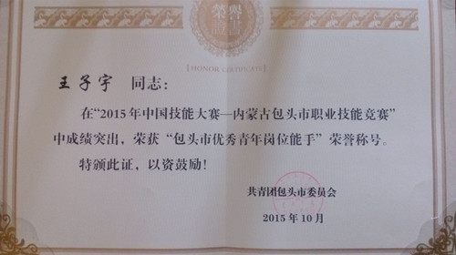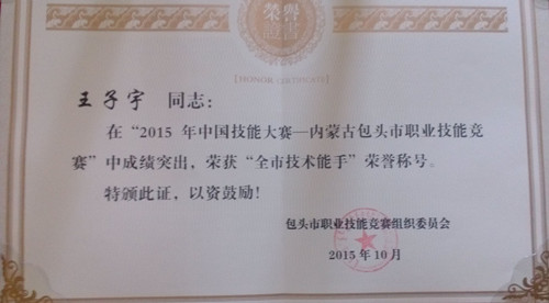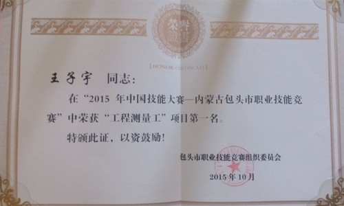 10月28日上午,2015年技能大赛—内蒙古包头市职业技能竞赛表彰会在市人力资源和社会保障局一号会议室举行,我校矿业与煤炭学院学生王子宇分获“2015年技能大赛—内蒙古包头市职业技能竞赛工程测量工”第一名、“包头市优秀青年岗位能手、全市技术能手”荣誉称号,并进入自治区决赛,获第四名。
