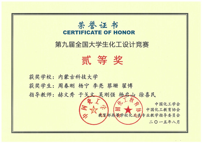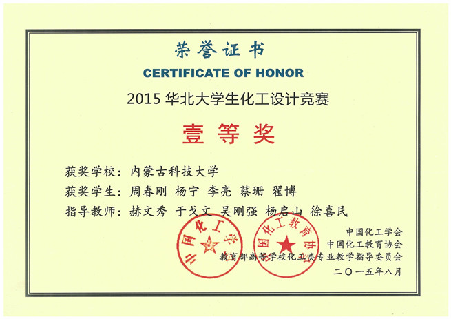 11月9日,化工学院收到由中国化工学会寄来的获奖证书,由我校化工学院学生组成的“鹿坪”代表队,在2015年第九届“东华科技-三井化学杯”全国大学生化工设计竞赛华北地区预选赛中荣获全国二等奖和华北赛区一等奖。