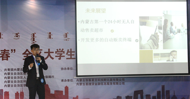 6月4日,由共青团内蒙古自治区委员会、内蒙古自治区教育厅、内蒙古自治区人力资源和社会保障厅、内蒙古自治区科学技术协会、内蒙古自治区学生联合会主办,内蒙古股权交易中心、呼和浩特市经济开发区管委会、呼和浩特留学人员创业园协办,内蒙古创客星空科技孵化器有限公司、内蒙古易捷贷金融信息服务有限公司承办的2016年“创青春”全区大学生创业大赛优秀项目路演在呼和浩特市留学生创业园如期举行。