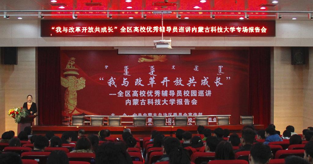 11月22日下午,由中共内蒙古自治区委员会宣传部、中共内蒙古自治区高等学校工作委员会、共青团内蒙古自治区委员会联合主办的“我与改革开放共成长”全区高校优秀辅导员校园巡讲报告会在js3845金沙线路图书馆报告厅举行。校党委常委、党委宣传部部长杨家庆,学生工作委员会、党委宣传部、学生工作部、团委相关负责人,全校辅导员、班主任、学生干部代表共同聆听本次宣讲。报告会由学生工作部部长杨海燕主持。