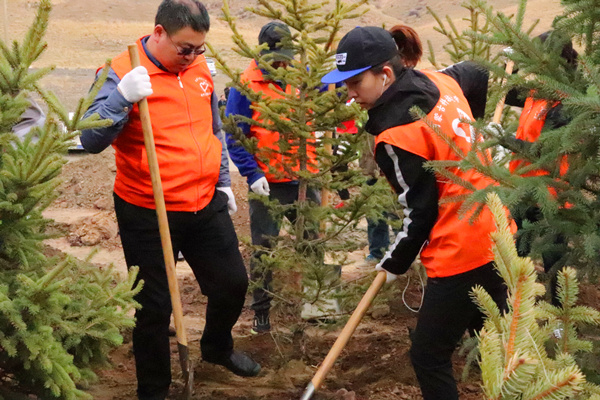 植树地点位于石门风景区,一到植树现场,大家就拿起自带的铁锹、手套等劳动工具,自行分组开始忙碌。身穿志愿者服装的老师同学们挥锹铲土、扶苗定植、两两配合,远远看去一片繁忙有序的劳动景象。付出一分辛苦,收获一份希望。经过大家的辛勤劳动,100余棵树苗迎风而立,师生纵情挥洒汗水,脸上绽放欣慰笑容。