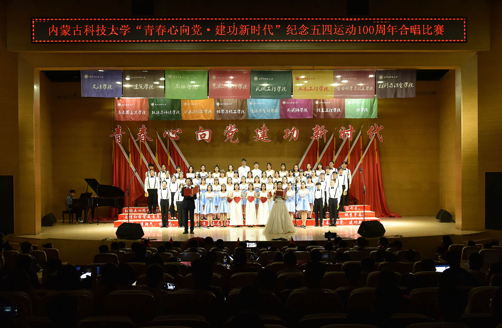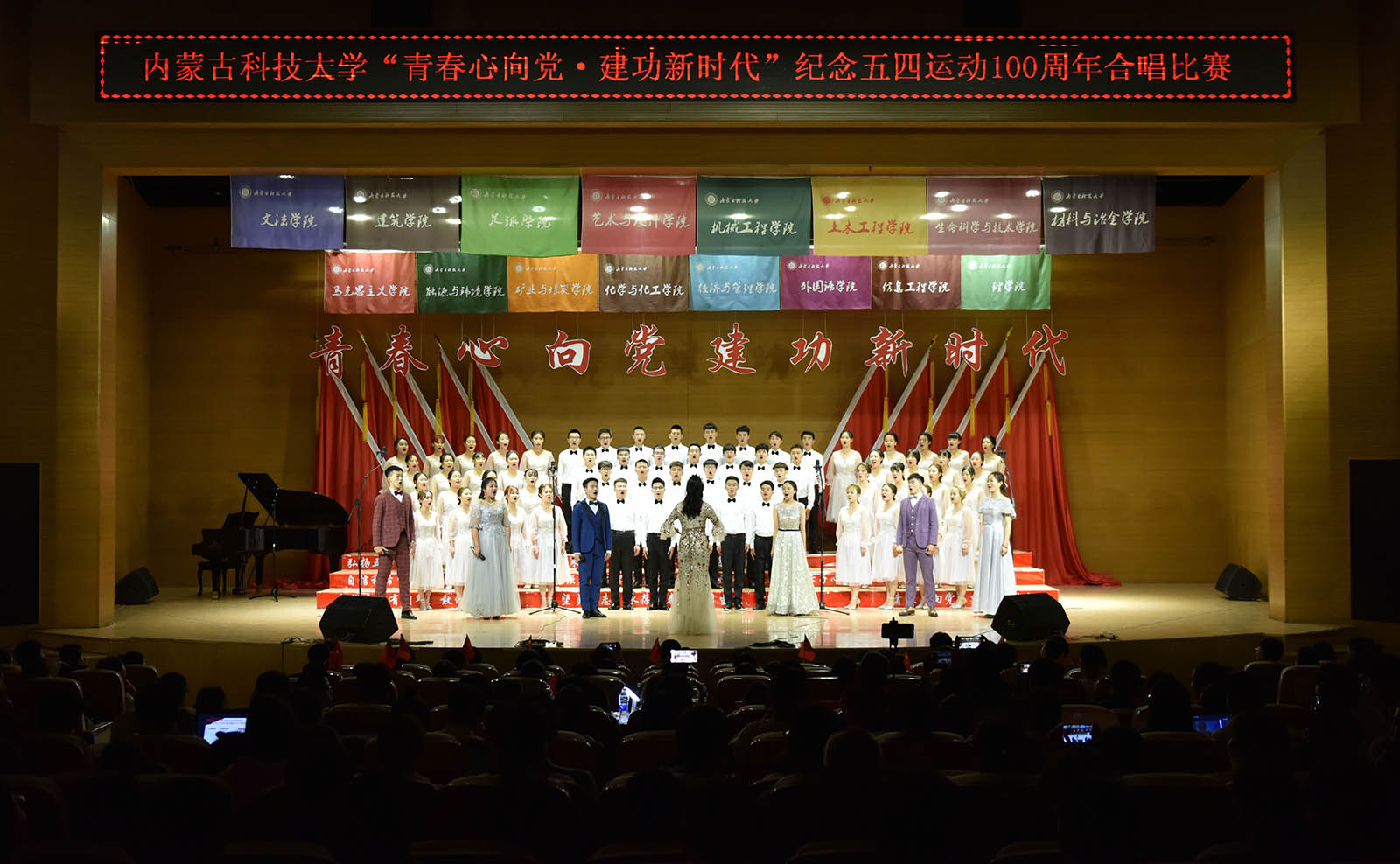 忆往昔峥嵘岁月,抒今朝爱国情怀。5月9日晚,“青春心向党·建功新时代”纪念五四运动100周年合唱比赛在js3845金沙线路音乐厅举行。校党委委员、宣传部部长杨家庆,学生工作部、团委相关负责人,各学院党总支书记、副书记、副院长及师生代表500余人到场观看。来自全市各艺术领域的5位教师吕艳花、史怀英、韩图雅、陆佳、乔羽担任本次比赛特邀评委。