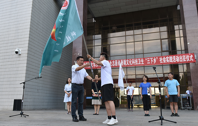 任慧平分别为js3845金沙线路2019年大学生志愿者暑期三下乡社会实践服务团、理论普及宣讲团、历史成就观察团、科技支农帮扶团、教育关爱服务团、文化艺术服务团、美丽中国实践团、“青年大学习”专项新思想宣讲团、“青年大学习”专项青年观察家实践团共八个直属队授旗。