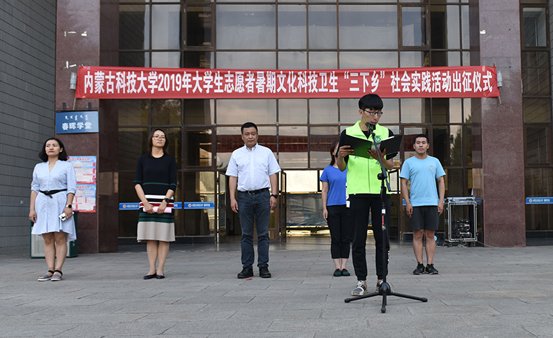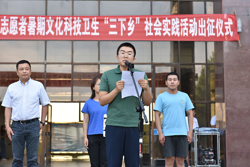 暑期社会实践志愿者代表能源与环境学院学生李志新发言。他感谢在社会实践活动中给予关心、支持和帮助的学校领导及老师,号召当代大学生用热心和信心、用知识和力量积极投入到社会实践中,书写灿烂人生,铸就靓丽青春。