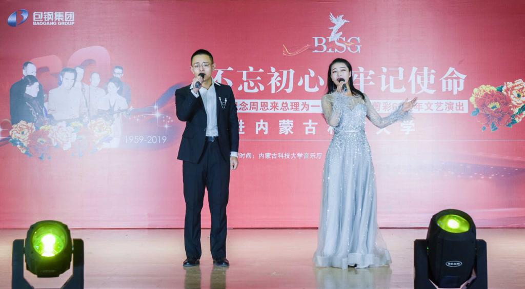 党委委员、党委宣传部部长杨家庆、内蒙古铁花文化产业投资有限责任公司副总经理葛彤,包钢乌兰牧骑副团长侯成刚到场观看了当晚的主题演出。演出在包钢乌兰牧骑轻快的小合唱《草原晨曲》中拉开序幕。饱含深情的歌曲《那一刻》,抑扬顿挫的诗朗诵《包钢没有忘记》,悠扬的独唱《金色的光辉把炉台照亮》,节奏鲜明,赞颂历年伟大领导人的快板《升国旗》,婉转动听的歌曲《誓言》,包钢乌兰牧骑的演员们以多样的艺术形式为现场师生奉上了一场精彩的文艺盛宴。演出现场,js3845金沙线路乌兰牧骑的大学生倾情演唱了歌曲《不忘初心》和《新天地》,唱出了属于当代大学生是时代声音。演出在歌曲《我和我的祖国》的悠扬旋律中落下帷幕。