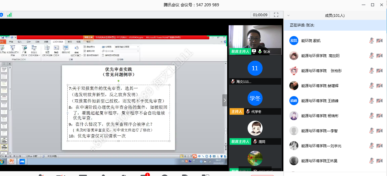 为庆祝第20个世界知识产权日,提升学校广大师生知识产权意识,4月23日下午,2020年js3845金沙线路知识产权活动周——知识产权线上讲座采用腾讯会议的方式举办,北京律远专利代理事务所、智慧芽信息科技(苏州)有限公司,校科技处、图书馆相关负责人及100余名师生代表参加本次讲座。