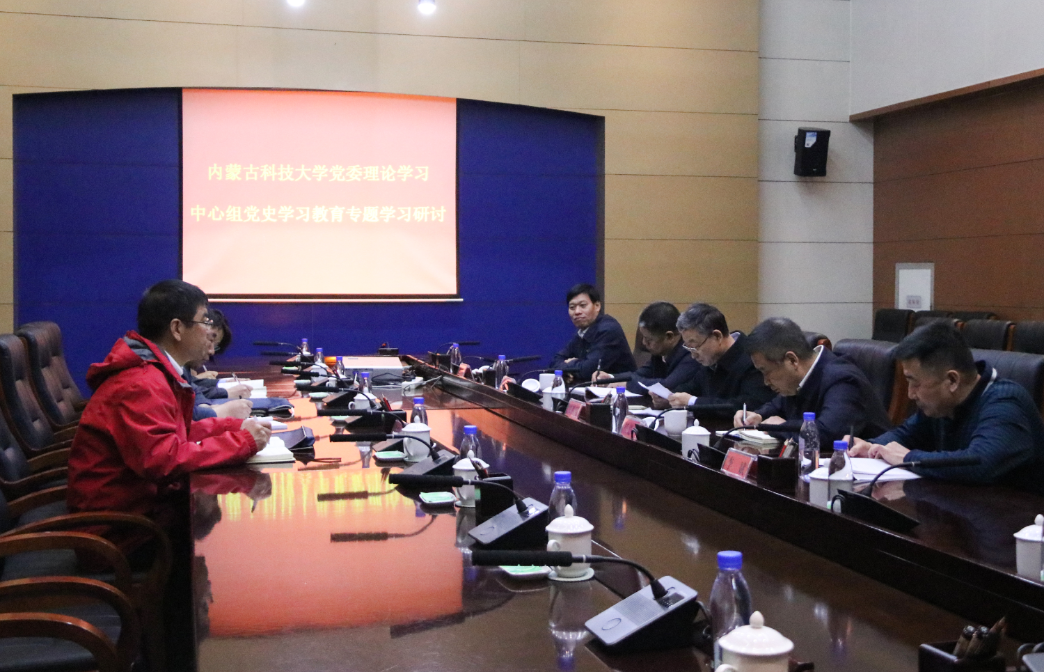参观结束后,校党委理论学习中心组在包钢集团会议中心集中学习了《中国共产党简史》第五章《中华人民共和国的成立和社会主义制度的建设》、第六章《社会主义建设的探索和曲折发展》的内容。全体成员怀着激动的心情进行了党史学习教育专题学习研讨。研讨重点围绕习近平总书记在十三届全国人大四次会议内蒙古代表团审议时重要讲话精神、习近平总书记关于民族工作的重要论述和党史(社会主义发展史)主题进行,校党委书记安胜利主持了学习会。