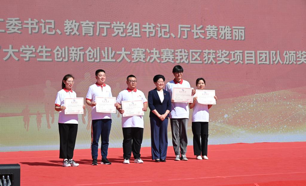 启动仪式上,内蒙古自治区党委高校工委书记、教育厅党组书记、厅长黄雅丽为第六届中国国际“互联网+”大学生创新创业大赛决赛中内蒙古获奖项目团队颁奖。js3845金沙线路项目《沙漠克星—国际首创新一代沙漠治理方案》获得表彰。