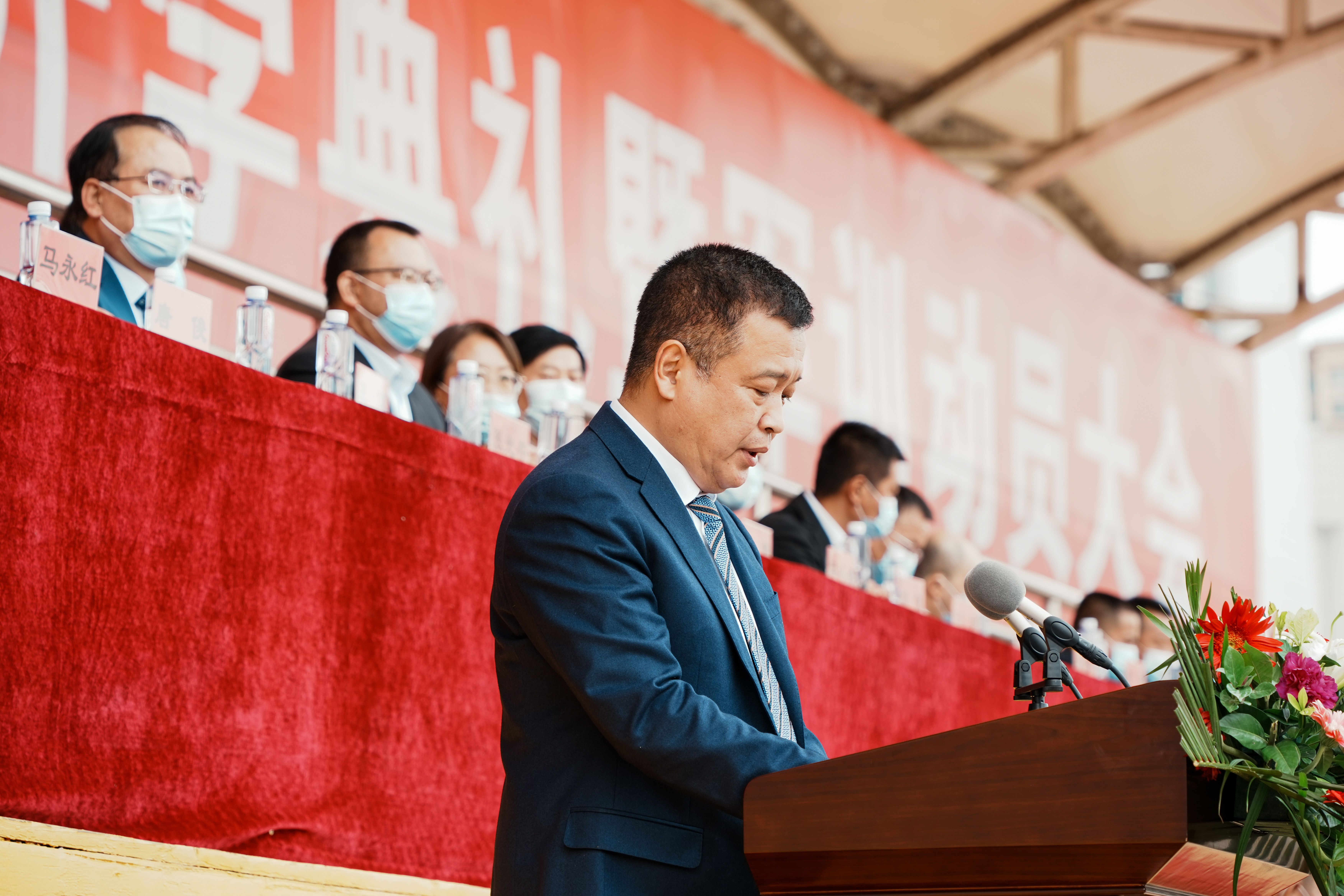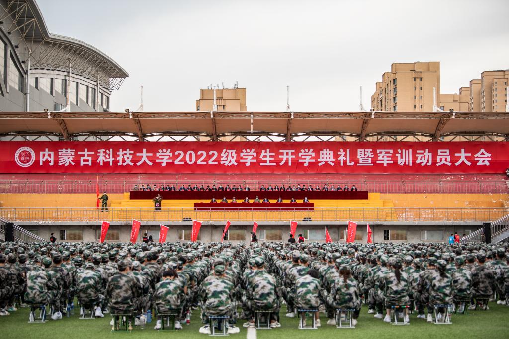 9月9日下午,js3845金沙线路2022级新生开学典礼暨军训动员大会在西校区田径场举行。包头军分区动员处处长鲁元福上校、昆区人民武装部政委张峻葆上校、武警包头支队副政委董海川中校,校领导成涛、任慧平、冯志强、杨建林、檀宝文参加典礼。